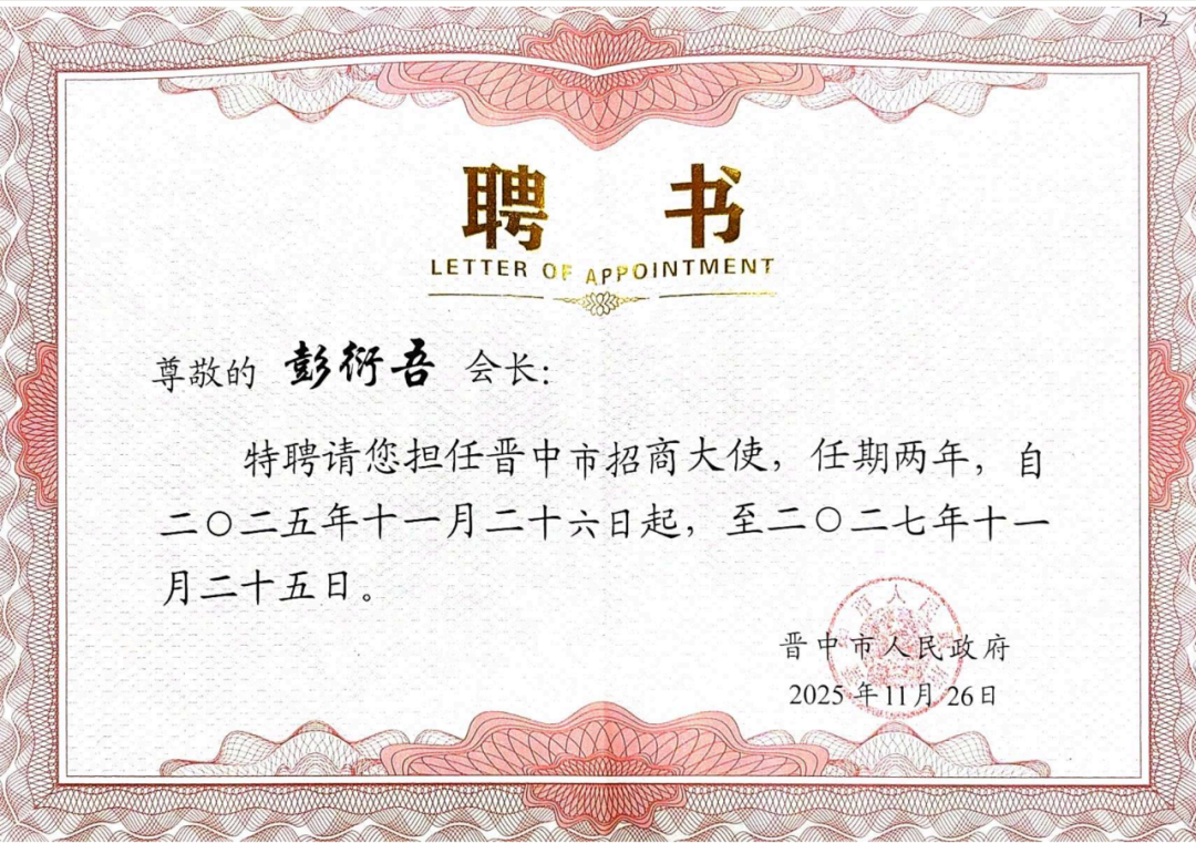11月26日,我会应邀参加晋中市招商大使聘任仪式活动,我会会长彭衍吾获聘“晋中市招商大使”。